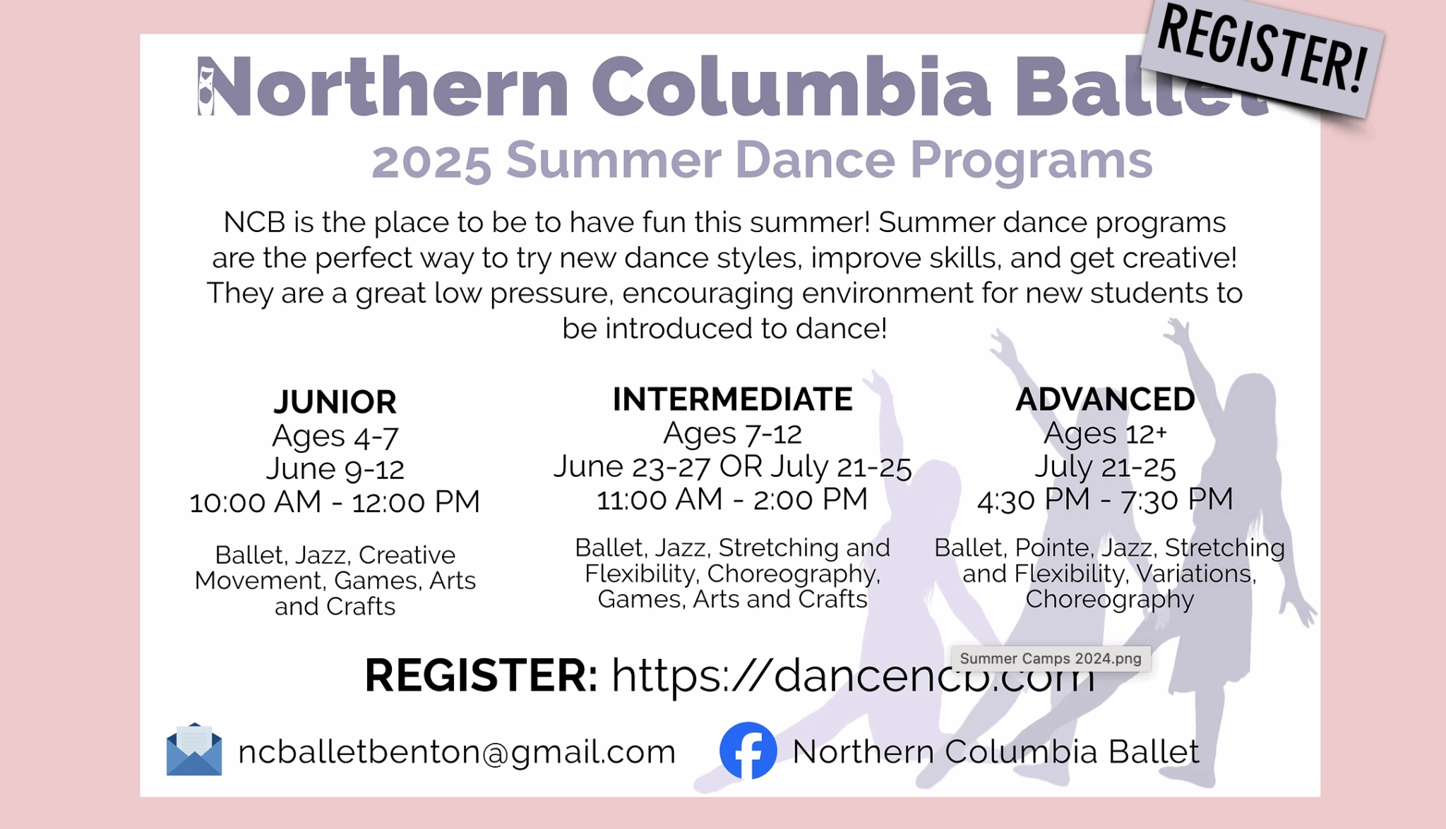 Advanced Camp is for our oldest dancers and not only focuses on improving technique and choreography memorization and creation, but also emphasizes pointe and pre pointe preparation as students begin to transition into our advanced levels!